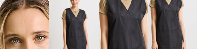Waterproof and bleach resistant. Round neck. Double centre pocket. Flattering feminine fit measuring 86cm in length.