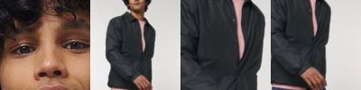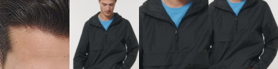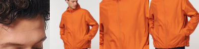Longer back length with curved hem for protection. Bottom hem and hood with adjustable plastic stopper and elastic cord. Sealed hood visor. Zipped welt pockets. Non-functional flap, front and back. Self-fabric half-moon at back neck. Inside zip opening at bottom hem and inside loop, with snap at armhole providing easy access for chest decoration. Oeko-Tex certified. Vegan certified. Fairwear Foundation certified.