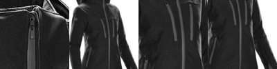 Longer back length with curved hem for protection. Bottom hem and hood with adjustable plastic stopper and elastic cord. Sealed hood visor and sealed welt pockets. Zipped welt pockets with extra grosgrain pull. Self-fabric half-moon at back neck. Inside zip opening at bottom hem and wearer’s left chest for easy decoration.