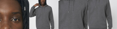 Unisex recycled hoodie sweatshirt. Made from in-house organic cutting waste. Set-in sleeve. Double-layered hood in self-fabric. Round drawcords in matching body colour with metal tipping. Metal eyelets. Inside herringbone back neck tape. Self-fabric half-moon at back neck. Single needle topstitch at neckline and along hood opening. 1x1 rib at sleeve hem and bottom hem. Armhole, sleeve hem and bottom hem with twin needle topstitch. Kangaroo pocket at front. The recycled fibres make the fabric surface less smooth.