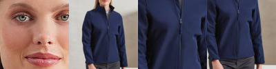 Two-layer softshell jacket with a bonded fleece inner, featuring two handy patch pockets. Full zip-through style with zip pulls. Cadet collar with chin guard. Zipped side pockets with zip pulls. Hook and loop strip on cuffs for adjustable fastening. Curved hemline with an elastic drawcord and plastic cord lock to secure in place. Stitched side panels enhance this more feminine fit. Made from 100% certified recycled polyester with Premier’s Windchecker® trademark for a wind- and water-resistant style that is suitable for screen print applications.