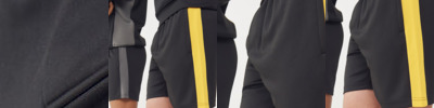 Shorts with elasticated waist and inner drawcords. Contrast side panels. Zipped side seam pockets. Twin-needle stitched hem.