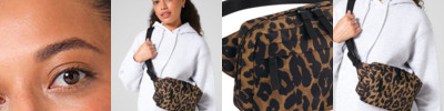 Leopard print design. Rear zipped pocket. Zipped main compartment. Zipped front pocket. Two-way zipped opening for easy access. Fully adjustable waist strap. Tear-away label for ease of rebranding. Contains 100% GRS-certified recycled polyester, certified by Control Union CU811033.