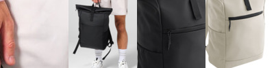 PVC-free. Minimalist styling. Water-resistant materials. Zipped main compartment. Elasticated mesh side pockets. Internal padded laptop sleeve, compatible up to 16". Padded back panel. Front pocket with water-resistant zip closure. Secure roll-top and clip closure system. Cord zip pulls with reflective detailing. Padded, adjustable shoulder straps. Grab handle. Tear-away label for ease of rebranding. Lining: 100% Recycled polyester.
