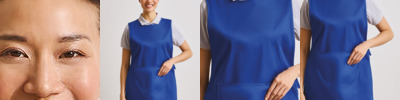 Side tabs with adjustable, stud-fastened closures. Colour-matched bias trim edges, large patch pocket. Crease resistant finish. Industrial laundry 85°C, domestic wash 60°C