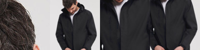3 layer waterproof bonded fabric. 4 way Super Stretch Soft Shell. Wind stop inner zip flap. Comfortable active fit. Zip through neck. Wind protect long back. Two zip closing pockets.