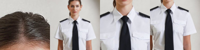Women's short sleeve easy care pilot shirt. Stiffened collar. 2 chest pockets with button flaps. Combined pen pocket on left breast pocket. Short sleeves. Epaulettes on shoulders. Easy care – soil resist finish. Size 8, 10, 12, 14, 16, 18, 20, 22, 24, 26