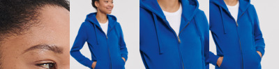 80% combed ringspun cotton/20% polyester. Cotton faced fabric.Brushed back fleece.Drop shoulder style.Ladies fit.Double fabric hood with topstitch detail.Flat lace drawcord with buttonhole eyelets.Taped neck.Full length covered YKK zip.Front pouch pockets.Ear phone access.1x1 ribbed cuffs and hem.Coverseamed around hood, shoulders, armholes, cuffs and hem.