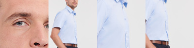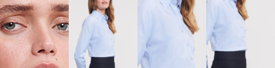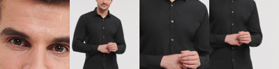 75% cotton/25% elastomultiester (LYCRA®T400®). Moisture management fabric.Fitted style.Neat modern collar.Concealed placket.Princess panels, no side seams.Back darts.Cocktail cuffs.Curved hem.