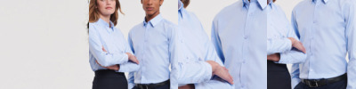 65% polyester/35% cotton. Unisex styling.Mandarin collar stand.Stainless steel stud closure.Industrial or domestic wash 60°C.