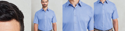Round tail bottom. Tailored fit. Adjustable cuffs. Double folded seams. spare button. Classic fused collar. Back yoke. Easy iron fabric.