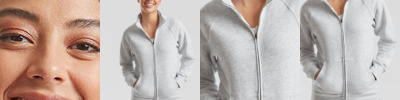 Covered zip for enhanced printability. Turtle neck collar with single jersey back neck tape. Narrow full length zip and two pouch pockets. Waist and cuff rib in cotton/elastane for shape retention.