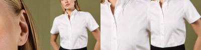 Taped back neck, contrast herringbone taped side vents, half moon yoke. Slanted placket. Contrast ipped collar and cuffs, comfort finish cuff seams. ape reinforced shoulder seams. Twin needle titched hem, shoulder and around armholes. Size 10, 12, 14, 16, 18, 20