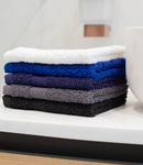 100% ringspun cotton. Luxurious thick pile terry towelling.Herringbone style single border.Excellent absorbency qualities.Hanging loop.