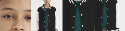Soft cotton faced fabric. Brushed back fleece. Taped neck with hanging loop. Knitted collar, cuffs and hem with stripe detail. Contrast stud closure. Contrast sleeves. Two welt pockets. Tear out label.