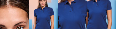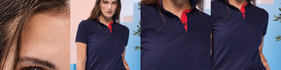 Fitted polo for women with contrast collar and placket. Two contrast coloured buttons on placket. Contrast colour on side vents. Twin needle stitching on hem. Ribbed knit collar and sleeve cuffs. Product contains no branded neck label. Removable Kimble or looped garment tags. Inner seam label holds important product information on one label with a second label containing brand information which can be cut-away. Please note old stock may contain a fixed branded label.