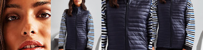 Tonal coil zip on centre front with signature zip puller and internal storm flap and chin guard. Horizontal stitched sandwiched narrow baffles. 250gsm lightweight polyester fill. Internal binding on all seams. Internal back neck hanger loop. Concealed zipped pockets with teardrop pullers. Stretch binding around armholes and hem for added protection. Packable bag. Product contains no branded neck label.* Removable Kimble or looped garment tags. Inner seam label holds important product information on one label with a second label containing brand information which can be cut-away.