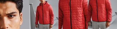 Contrast coil zip on centre front with signature zip puller and mouse tail piping on each side of zip opening. Front and back square stitched baffles with linear side narrow baffles. 250gsm lightweight polyester fill. Fully-lined in tonal polyester. Inset welt pocket with concealed zip opening and double zip garages. Contrast stretch binding on hem, cuffs and hood opening for added protection. Internal piping around inside facing. Secure hood attached to collar. Internal zipped opening on back panel for embroidery access. Internal welt pocket. Product contains no branded neck label.* Removable Kimble or looped garment tags. Inner seam label holds important product information on one label with a second label containing brand information which can be cut-away.