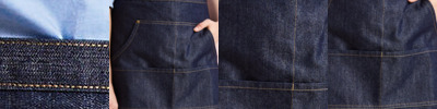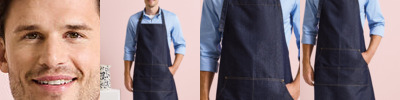Denim bib apron with contrast stitching. Adjustable buckle on the neckband. Copper rivets. Four pocket compartments. 86cm long and 72cm wide. WRAP certified. Oeko-Tex certified. BSCI certified. Reach certified. SEDEX certified.