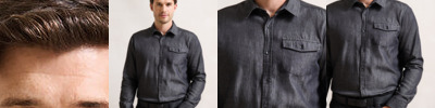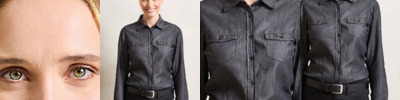 Long sleeve denim shirt with contrast stitch detail with two chest pockets. Buttoned cuff and sleeve guard. Curved hem. Back yoke.