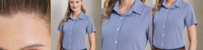 Short sleeve fitted shirt with soft collar styling. Gingham pattern. Curved hem. Bust and back darts. Back yoke.