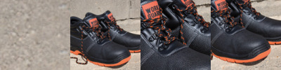 SBP safety boot. Steel toe cap and steel midsole. Eyelets: Black with a sheen. Laces: all Orange + spare sets in Orange/Black and all Black. Upper: Black embossed split leather upper. Ankle internal: Inside lining, mesh black. Toe: EVA black toe. Sole: Duel density Black/Orange PU sole. Collar: Process black padded collar. EN 20345:2011 S1P SRA.