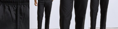 Unisex pull on chef’s trouser. Available in large “Black & White” Check or Black. Elasticated waist for easy pull on trouser. Unisex sizing. Stocked in 30.5” inside leg. Side swing pockets. Draw cord.