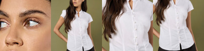 Mandarin collar with cap sleeve and front inner placket. Square buttons with fabric looped button holes. Two front darts, two back darts in a fitted style. Size: 8 10 12 14 16 18 20
