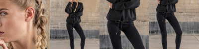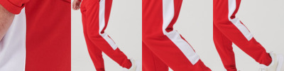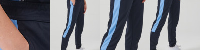 100% polyester interlock. Slim leg. Elasticated waistband. Two side zip pockets. Contrast side panels (black and navy are self colour). Ankle zips with zip guard and semi-automatic lock zip sliders.