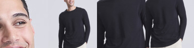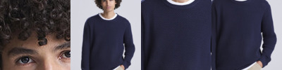 Regenerated cotton blended with recycled polyester sweater. Seed stitch knit with rib neck, cuffs and hem.