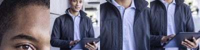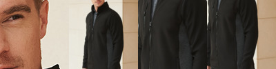 Two layer soft shell. 96% polyester/4% elastane outer. Polyester micro fleece backed. Collar high zip with chin guard and inner zip guard. Contrast breathable underarm and side panels. Right chest zip pocket. Inner pockets. Two front zip pockets. Open cuffs and hem. Drop hem. Cut out label.