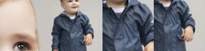 PVC rain jacket with stripped single Jersey 100% cotton lining. Patch front pockets. Zipper and popper opening. Straight hem and cuffs. Lined hood. Size tab only.