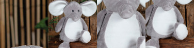Soft plush elephant. Contrast cream inner ears, feet, and front panel. Sewn eyes. Zip access on base for direct access onto the tummy for decoration. Removable inner stuffing. Zip access to both ears for decoration onto the ears. Can be embroidered or sublimation printed. Complies with EN71 European Toy Safety regulations. Remove all hang tags and their fasteners before giving these items to a child. Suitable for children of all ages.