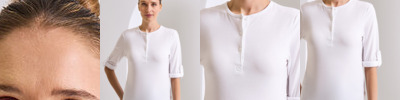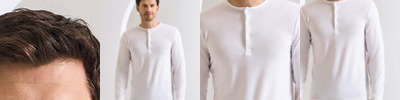Long sleeve tee that has roll sleeve capabilities with button tab on the inside of the sleeve to secure in place. Round neck style with a three button placket. Twin-needle stitching to the hem and cuff.