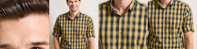 Long sleeve semi-fitted shirt for men with a multi-coloured contrast check pattern. Single button cuff and sleeve guard which is designed to be rolled up and secured in place with a button and tab on the upper arm. Soft collar styling with curved hem.