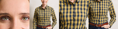 A women's long sleeve semi-fitted shirt with multi-coloured contrast check pattern. Single button cuff and sleeve guard which is designed to be rolled up and secured in place with a button and tab on the upper arm. Soft collar styling with curved hem.