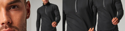 ¼ zip Jersey top with wicking finish. Long sleeves with thumbhole and fold over cuffs. Elasticated binding on cuffs and hem. Raglan shoulder seams with flatlock stitching and reflective dots detail on back of garment. 1/4 length zip with reflective trim and semi-automatic lock zip slider. Stand up self-fabric collar. Side panels. Key pocket on left back panel seam with concealed zip and inner headphone access hole. Tombo tear-out label.