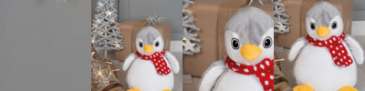 Soft plush grey and white penguin with a contrast knitted scarf. Sewn eyes. Contrast feet and beak. White coloured panel on tummy is perfect for decoration. Zip access on base for direct access onto the tummy for embroidery or print. Removable inner stuffing. Can be embroidered, printed and sublimation printed. Complies with EN71 European Toy Safety regulations. Remove all hang tags and their fasteners before giving these items to a child. Suitable for all ages.