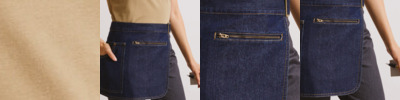 Hip apron with adjustable self-fabric waistband. D-ring and carabiner fastenings. Jeans style stitched pockets. Zipped pocket.