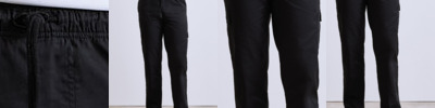Typical cargo pocket detail on the legs with tear release fastening. Mobile friendly cargo style pockets. Elasticated waistband with drawcord. Single rear patch pocket with tear release fastening.