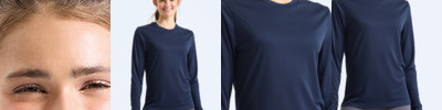 Wicking fabric. Stretch. Crew neck. Long sleeve. Lightweight. Twin-needle stitching on hem and arms. Mesh back. We recommend using block out vinyl and inks.Product contains no branded neck or waist label. Removable Kimble or looped garment tags. Inner seam label holds important product information on one label with a second label containing brand information which can be cut-away. UPF 40+.