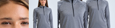 Contrast ¼ zip. Long sleeves. Stretch. Twin-needle stitching. Wicking fabric. We recommend using block out vinyl and inks.Product contains no branded neck or waist label. Removable Kimble or looped garment tags. Inner seam label holds important product information on one label with a second label containing brand information which can be cut-away. UPF 40+.