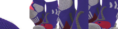Anatomically shaped with reinforcement for optimum protection and compression. Strategic double-layer cusion impact. Pinpoint compression layers stimulate circulation. Coolmax® yarns keep cool and dry. Rib cuff. Durable knit. Trainer length. Contrast colour trim. Heel/Toe cushioning and arch support. Fast-dry.