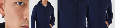 Trendy organic zipped hooded sweatshirt with retail fashion oriented look and feel. Strong styling with great fitting and perfect length. Side seams ensure the best fit and a masculine silhouette. Visible 'Hi, I'm Organic' neck tab to highlight the organic value of the garment. Easy branding solution - B&C No Label Solution. Inside single Jersey halfmoon in back to allow easy branding personalisation. Qualitative herringbone neck tape. Retail like features: covered metal zip, single Jersey lined hood, qualitative herringbone neck tape and fashionable drawcord.